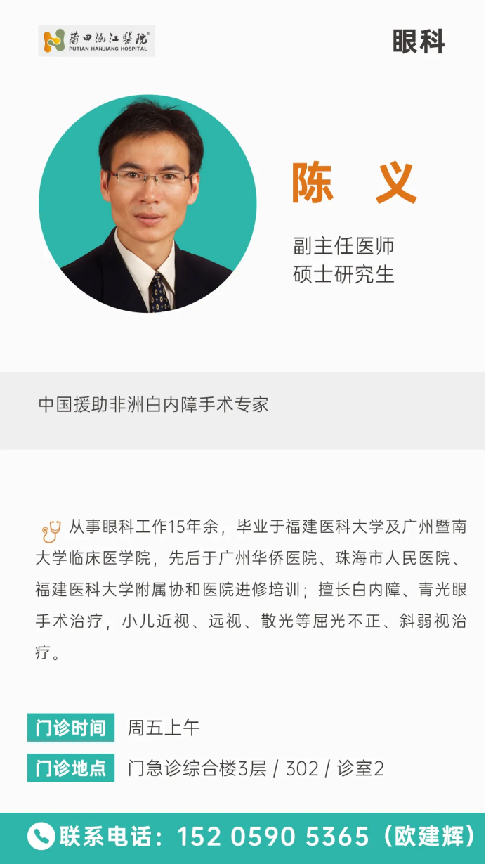 作为莆田涵江医院眼科的帮扶专家,陈义副主任医师的到来为本地白内障患者带来了福音。他拥有十余年眼科临床经验,累计完成白内障手术超万台,在白内障、青光眼手术及儿童屈光不正、斜弱视治疗等领域造诣深厚。
